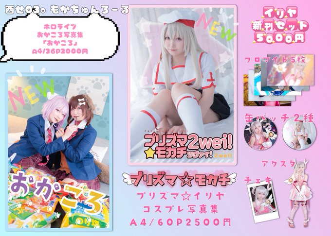 コミケにいるよ❕ 日曜西せ03-aもかちゅんろーるにて頒布予定の写真集です(∩・∇・∩) プリズマ☆イリヤ コスプレ写真集 ♢プリズマ☆モカチ2wei! A4/60P/2500円 ホロライブおかころ コスプレ写真集 ♢おかころ🐱🐶 A4/36P/2000円 おしながきと予約は明日告知します😭… twitter.com/i/web/status/1…
