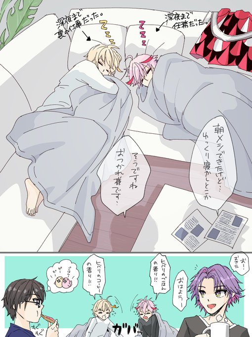 とあるアジトの朝タクション💛💜💙❤ #VOLTA展 #ふうらーと #四季彩画 #わたらいらすと #SeraPic