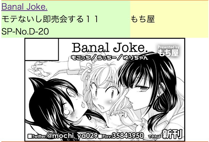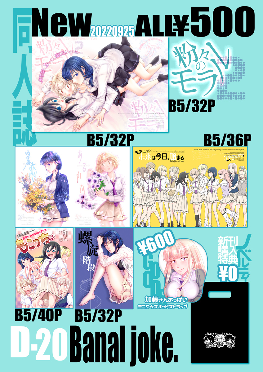 43 109 #モテ即11 #わたモテ Banal Joke.はD-20に配置されました。 新刊・ノベルティ・色紙情報は9月第4週ごろまでに詳細を改めてお知らせします。 サークルカット更新しました😊 22/09/05 00:30