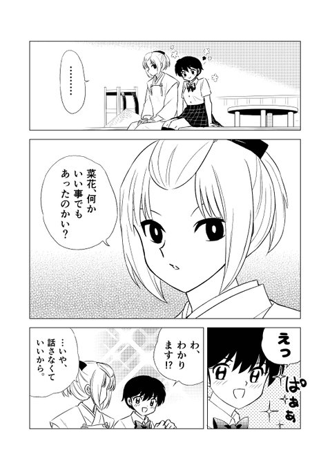 10 75 #リプ来たセリフで一コマ描く キャラお任せ「何か、いい事あったのか?」 キャラお任せなので口調に合わせて若干変更してます。 菜花ちゃんは顔に出る 22/09/17 22:56
