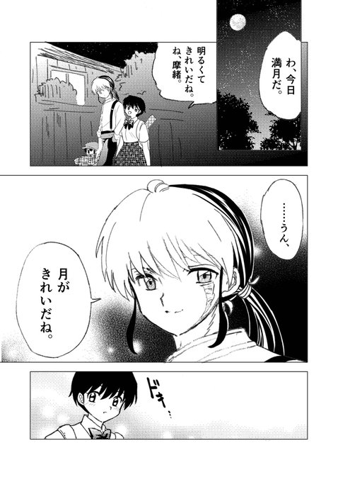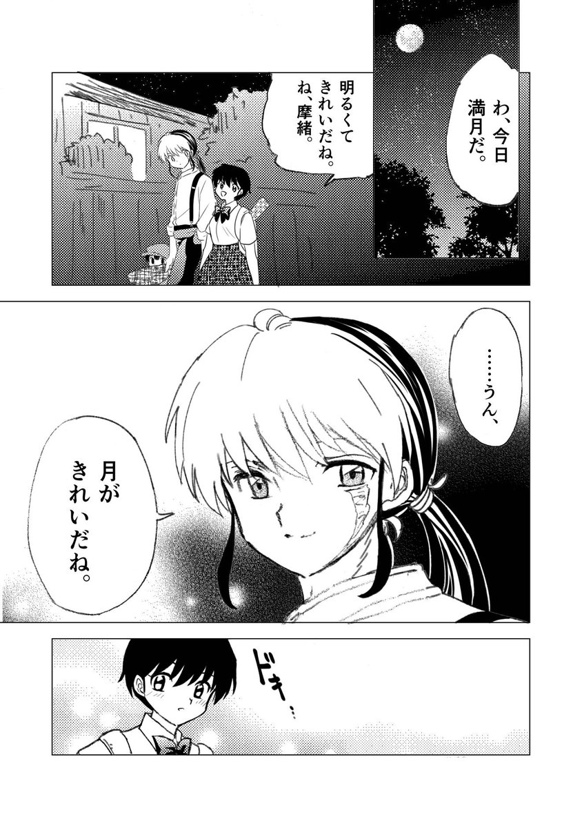 #リプ来たセリフで一コマ描く 摩緒で「月がきれいだね」より 一コマってより前後出てきちゃって一ページになってしまった…(;^ω^) 一日一枚ずつアップできれば良いな~と…
