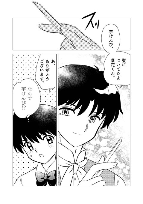 #リプ来たセリフで一コマ描く 本日は華紋さまで「芋けんぴ、髪についてたよ」です 5つ中4つは漫画形式になっちゃってるわ…