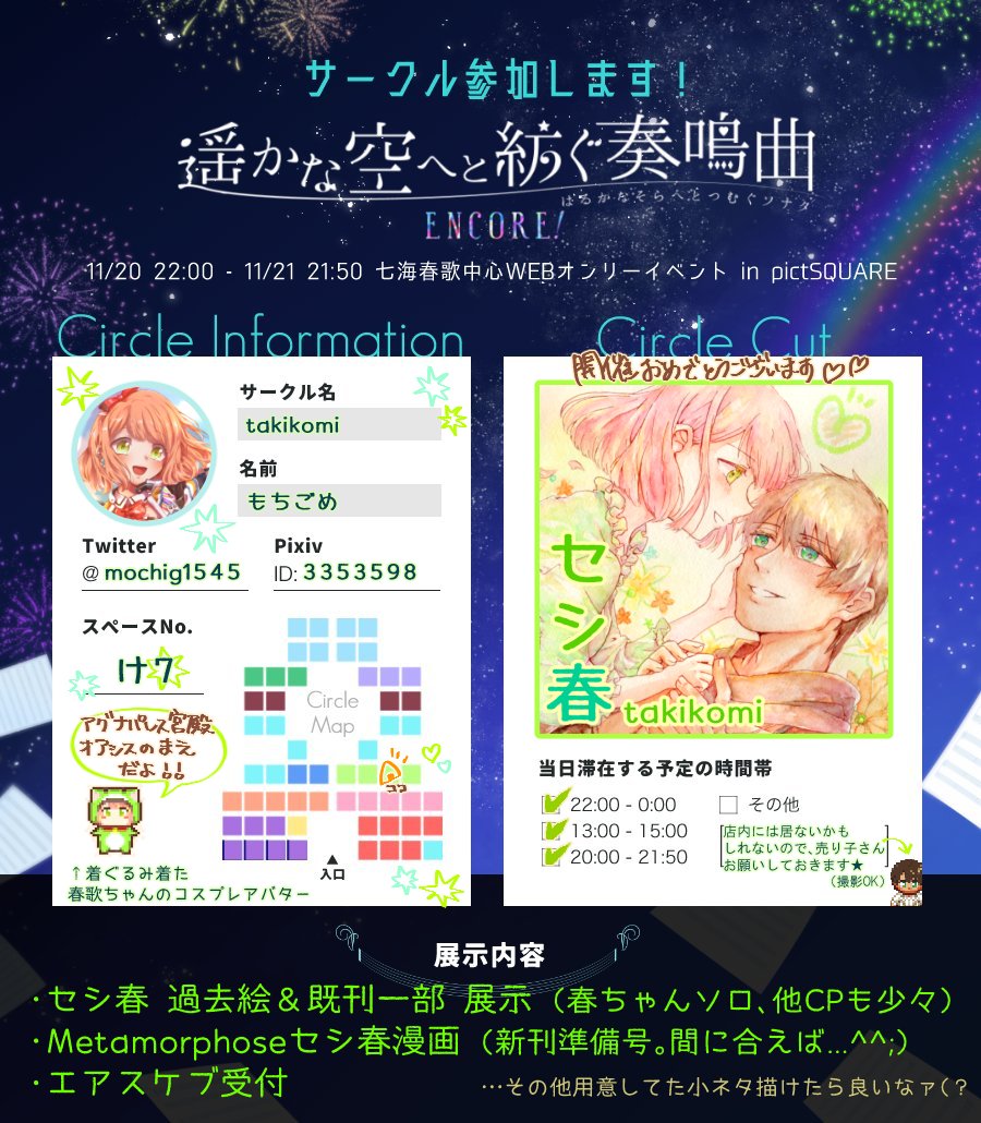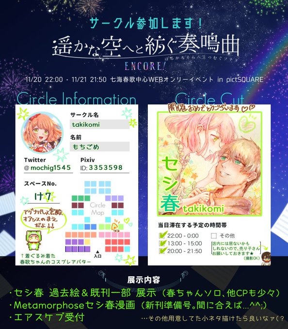 七海春歌WEBオンリー「遥かな空へと紡ぐ奏鳴曲 ENCORE!」(@harukaonly_web )にサークル参加します! 向かって右手側、セシ春空間inアグナパレスにスペース頂きました🌟【け7】です! 過去作(&間に合えば新作)の展示、エアスケブの受付を予定しています。 宜しくお願いします💚 #春歌WEBオンリー2