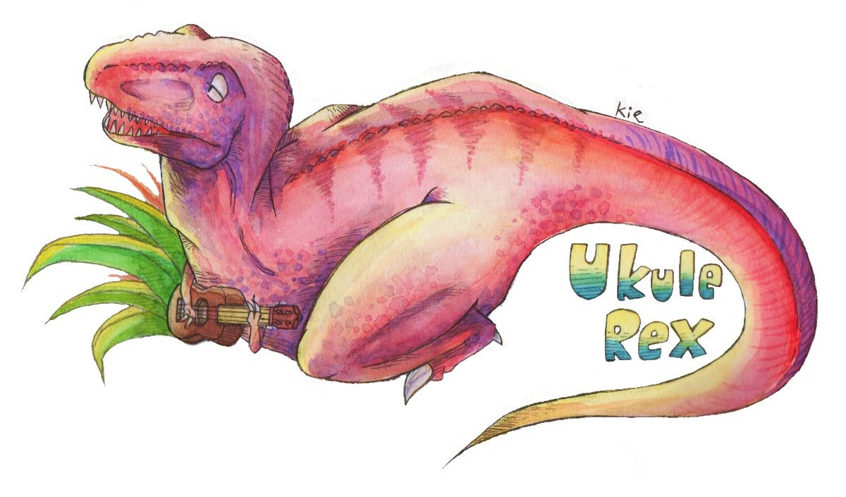 ウクレレックス。レックスの目がどことなくメランコリックなのは、彼なりに思うことがあるんでしょうね #恐竜 #ティラノサウルス #水彩 #水彩画 #絵描きさんと繋がりたい #絵描きの輪 #dinosaur #tyrannosaurus #watercolor