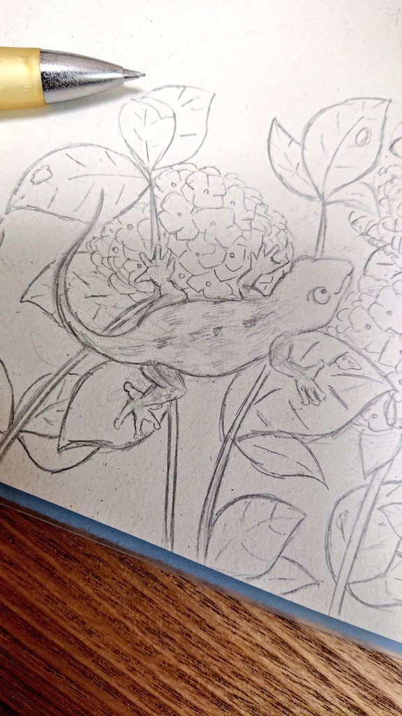 爬虫類仲間(*^^*)紫陽花の上で。 #イラスト #爬虫類 #紫陽花 #植物