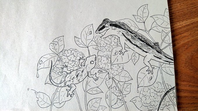 0 3 爬虫類仲間(*^^*)紫陽花の上で。 #イラスト #爬虫類 #紫陽花 #植物 22/06/12 17:15