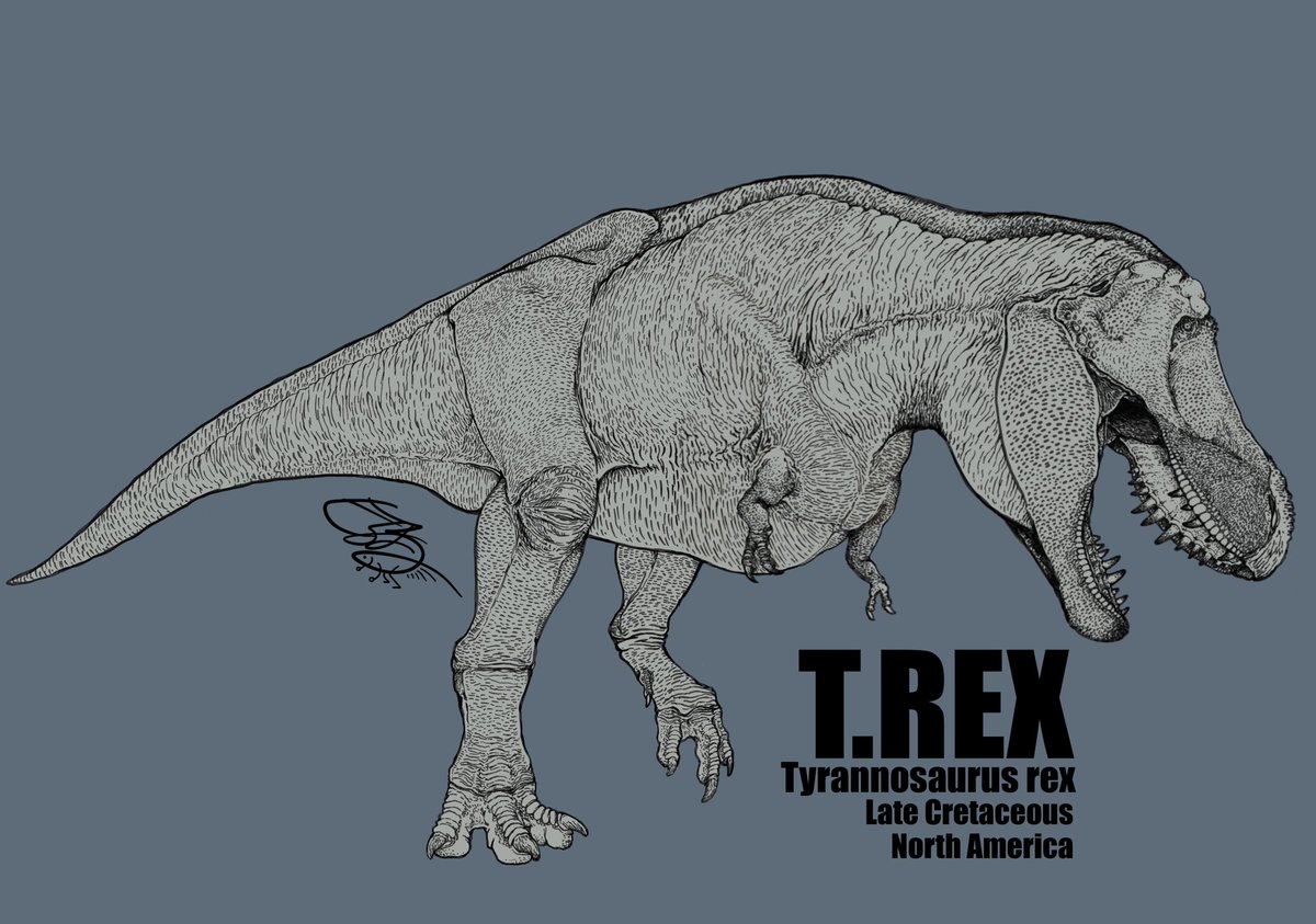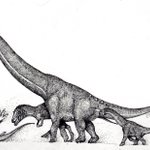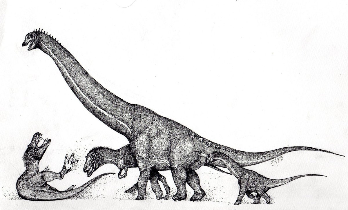 アラモサウルスと若いティラノサウルスのつもりで描きました。