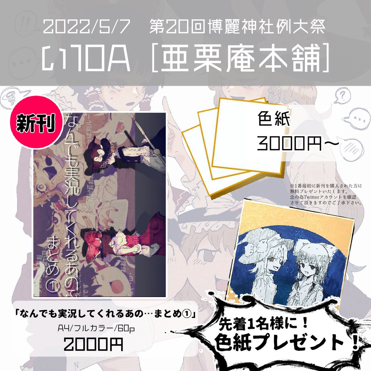 #例大祭20 第20回博麗神社例大祭 サークル「亜栗庵本舗」お品書きになります。新刊は今までの #なんでも実況してくれるあの二人 シリーズのイラスト四コマ漫画まとめ集になります。よろしくお願いします。