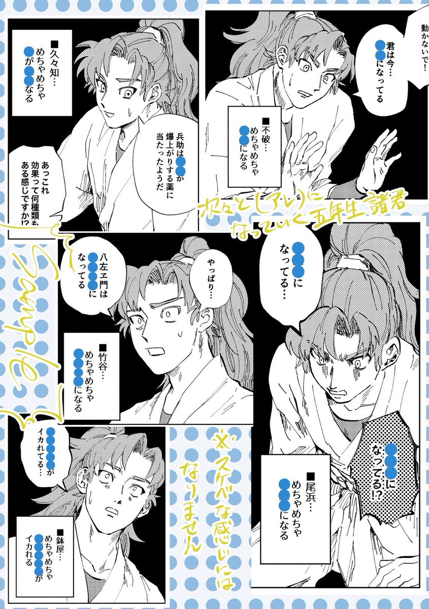 5/3 超忍FES 新刊サンプル(1/3) 五年が伊作の薬で事故って色々アレになりつつ頑張るギャグ漫画です pixiv.net/artworks/97939… 【めちゃめちゃ●●(アレ)になる薬】 A5/56p/¥500 ■サークル名:図1 ■スペース:東1ホール N14b