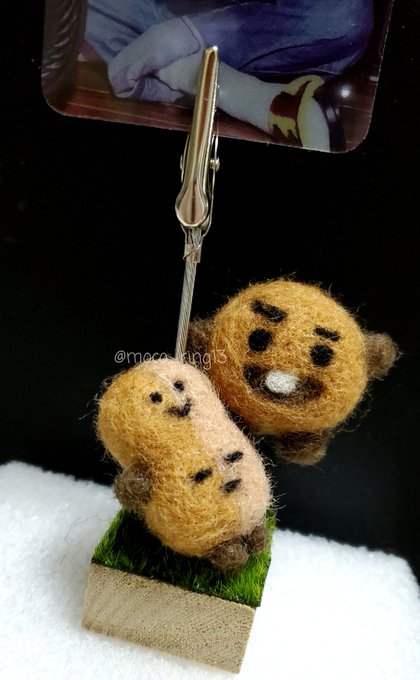 イェア‼️ メモスタンドにした。 クリップの挟んだ所跡つきやすいから、トレカは挟んじゃダメなやつ…🥺ぴえん #BT21 #shooky #メモスタンド #ハンドメイド #羊毛フェルト #fanart
