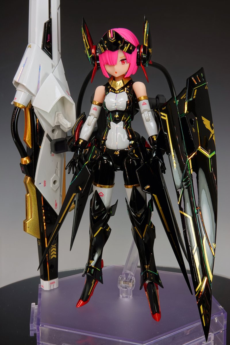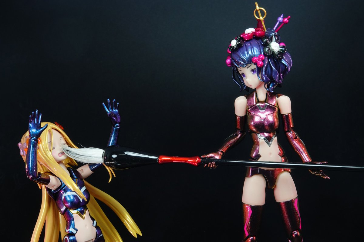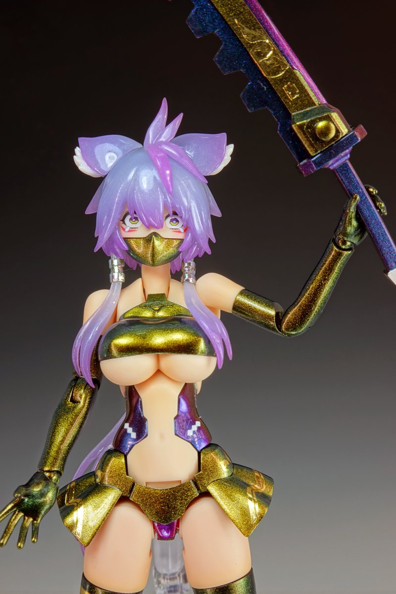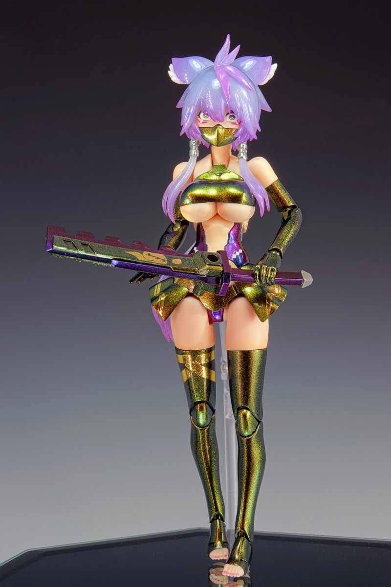 #メガミデバイス エクスキューショナー ブライド完成。究極レインボーとテラクロームの練習用に塗ってみた。究極レインボーは波長の広い光じゃないと発色が悪いので晴れた日を狙って撮影してみた。