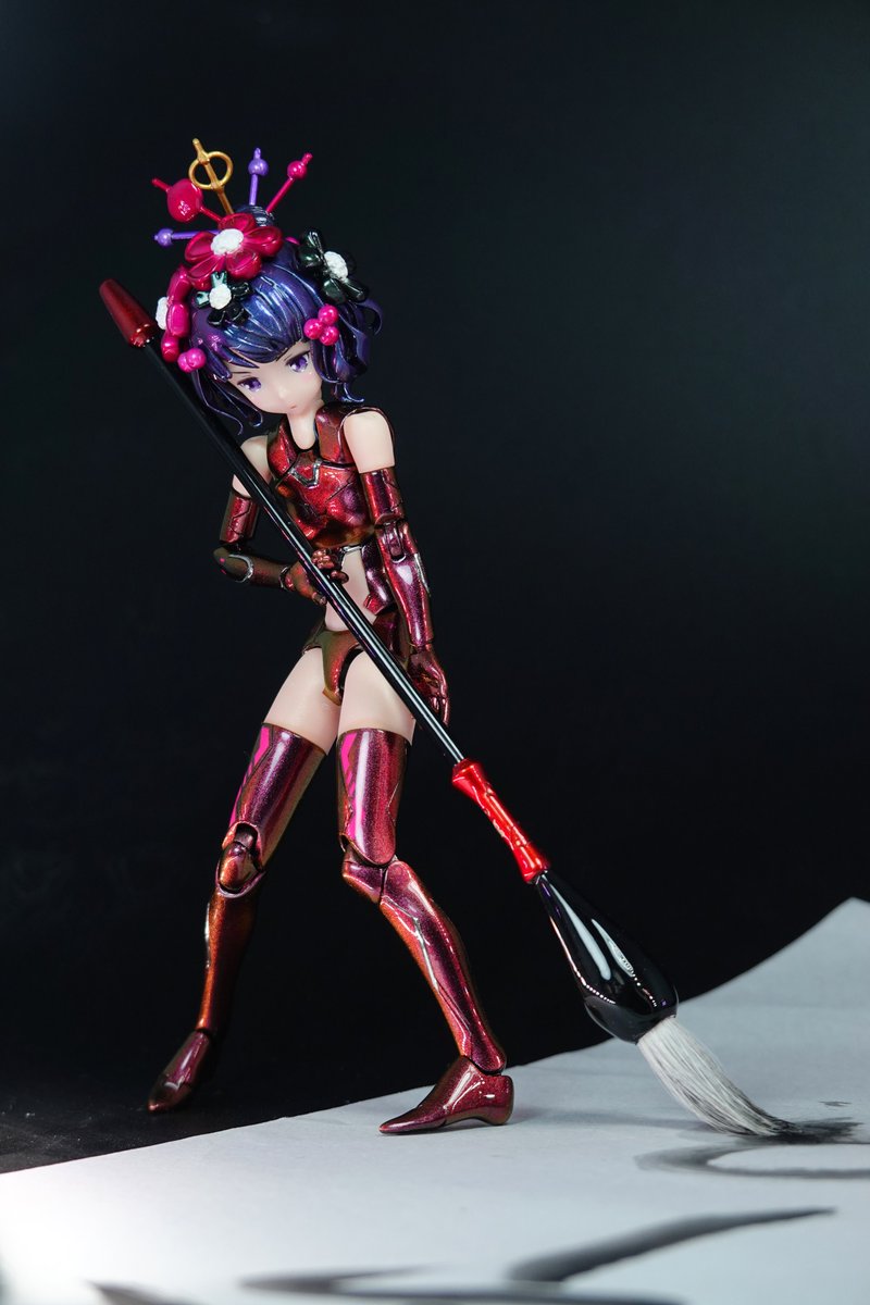 #メガミデバイス SOL RAPTORの素体モード。FGOの葛飾北斎風に髪を造形してみた。筆は100均の書道用筆と真鍮棒とエポパテで造形。ボディはShow upのトラペジウムで仕上げた。髪の毛にも偏光塗料を薄く乗せた。