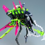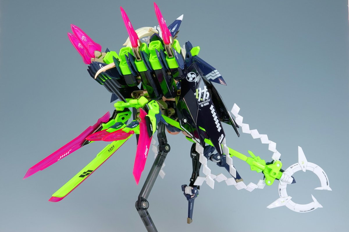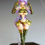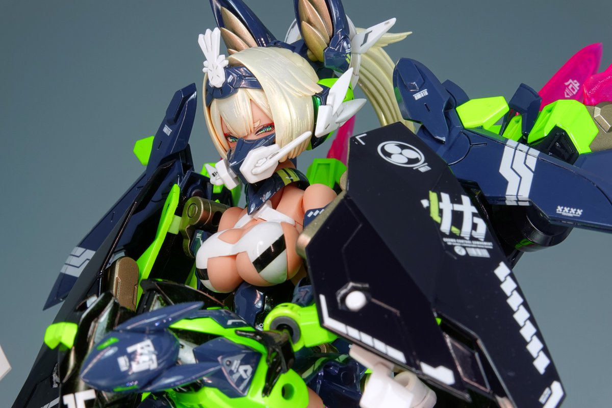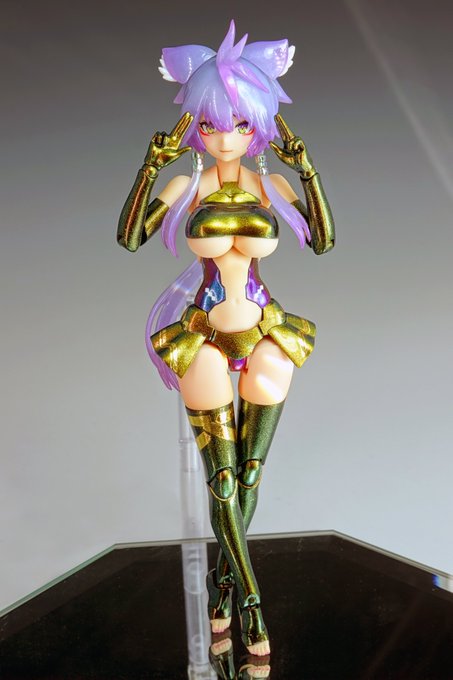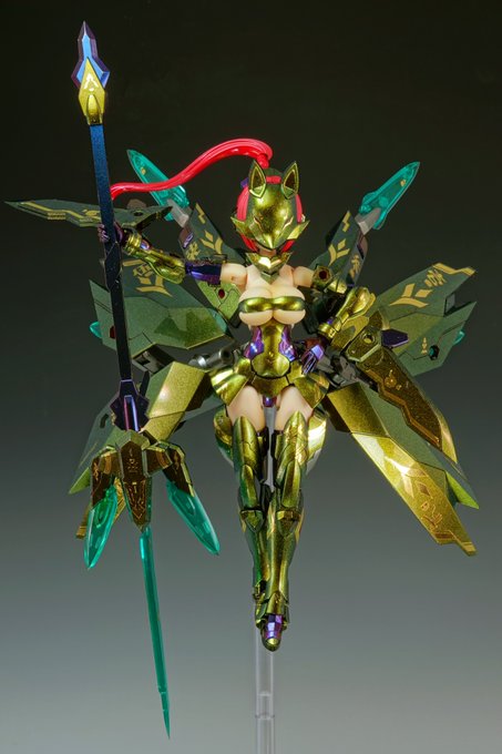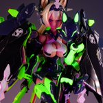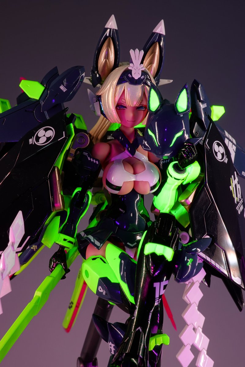 メガミデバイス 朱羅 玉藻の前の武装モード。フトモモをボトムスセットに置き換えてパケ絵のように足を組めるように改良。黄緑部分はネオンカラーで塗装し、全体をウレタンクリアで鏡面仕上にしてみた。 UVを照射するとネオンカラーが光って楽しい。 #メガミデバイス