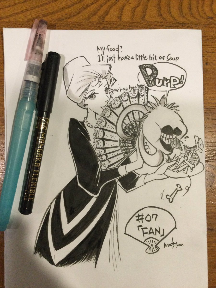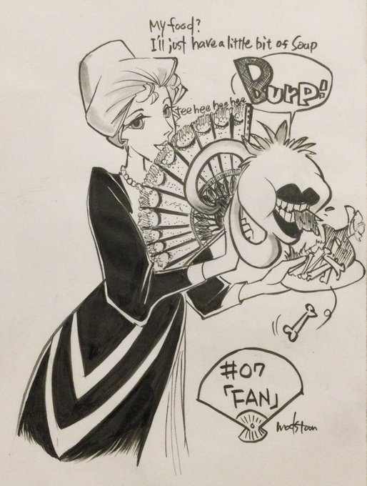 #インクトーバー #inktober2021day7 #kuretake_inktober2021 「扇」 アタクシのお食事? スープをほんの少し頂くぐらいですのよおほほほほ。ゲプッ 西洋版飯食わぬ女房