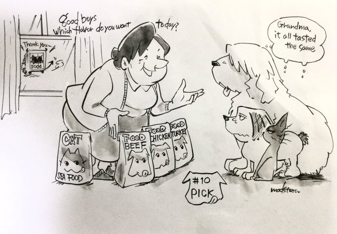 #インクトーバー #kuretake_inktober2021 #inktober2021day10 「選ぶ」(pick) 「良い子たち〜、今日はどの味がいい?」 「おばあちゃん、それ全部同じ味だわ」 メーカーの努力を灰塵に帰すアクマ印