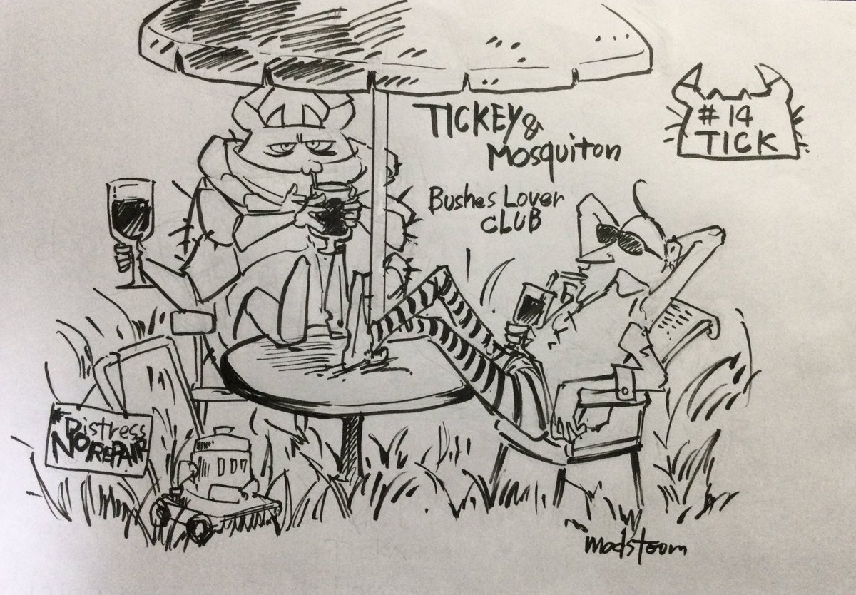 #inktober2021day14 #kuretake_inktober2021 #インクトーバー #inktober 14日目「ダニ」(tick) ダニーとモスキートン 草むら愛好クラブ 草刈り機故障中、直すの厳禁