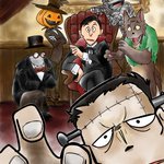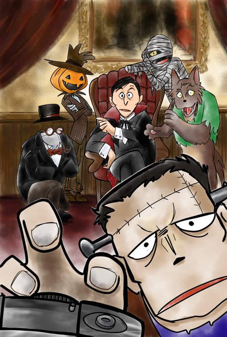 #ハロウィンイラスト展示会2021 #ハロウィンイラスト #halloween2021 「おいカメラ傾いじゃったぜ」 「あーもうちょっと右だ、右」 「ウァー」 (ちょっと岸田森似のドラキュラw)