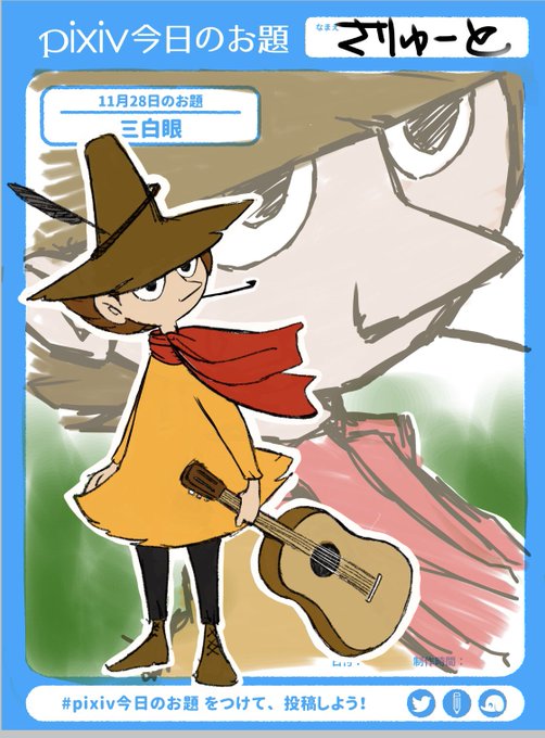 #pixiv今日のお題 「三白眼」 若年層が多いピクスケに49年前のスナフキンを投入 緑の帽子とコートじゃない! なんでパイプ咥えてるの? ギターって無いわ〜 そもそも、え、誰? ごめんね、年寄りのスナフキンはコレなの