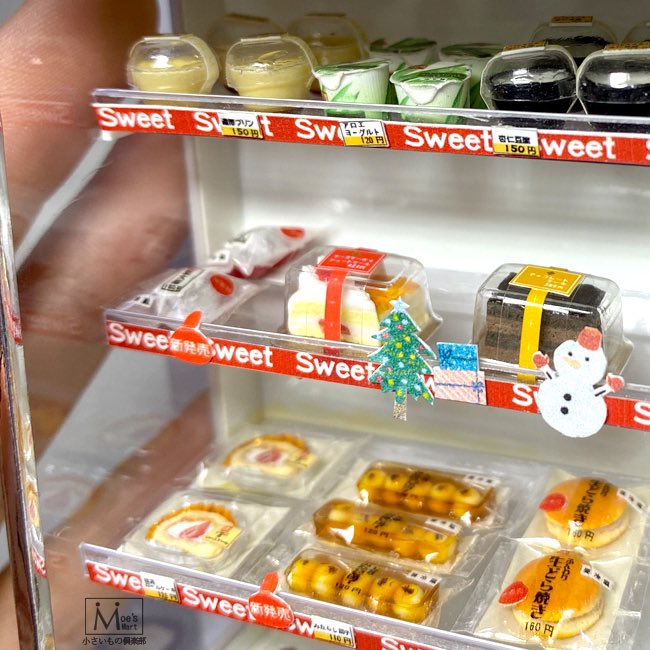 展示品のコンビニ陳列棚にケーキ2種類を陳列しました!美味しそうに見えたら嬉しいです。POPはクリスマス仕様にしてみました。明日からミニチュアアート展2022開催です。私はオンライン参加します。よろしくお願いします~!期間中にシークレット販売をするかもしれません😉 #ミニチュアアート展2022