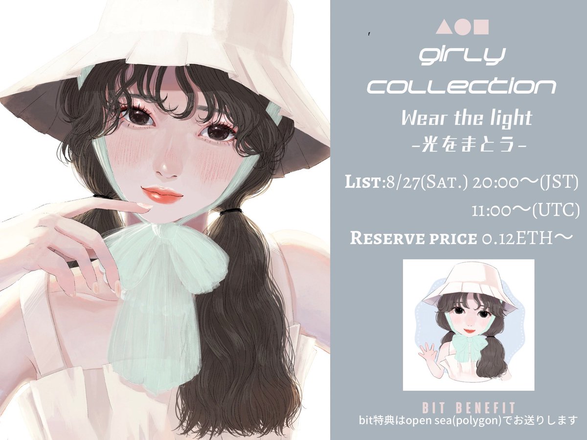 20 68 🎉FND first auction🎉 『Wear the light -光をまとう-』 ▶︎8/27(sat.) 20:00〜(JST) 11:00〜(UTC) ▶︎0.12ETH〜 🌟 There's a special offer for all who bit! foundation.app/@moeco_nft/gc-… #FND #NFT #NFTart 22/08/24 19:29