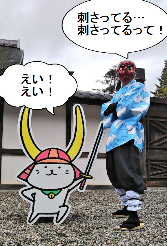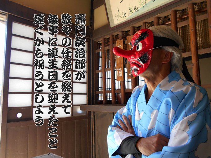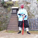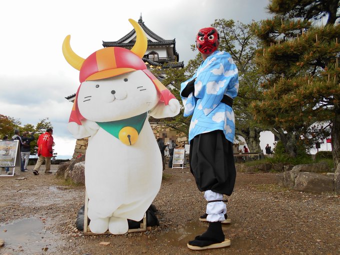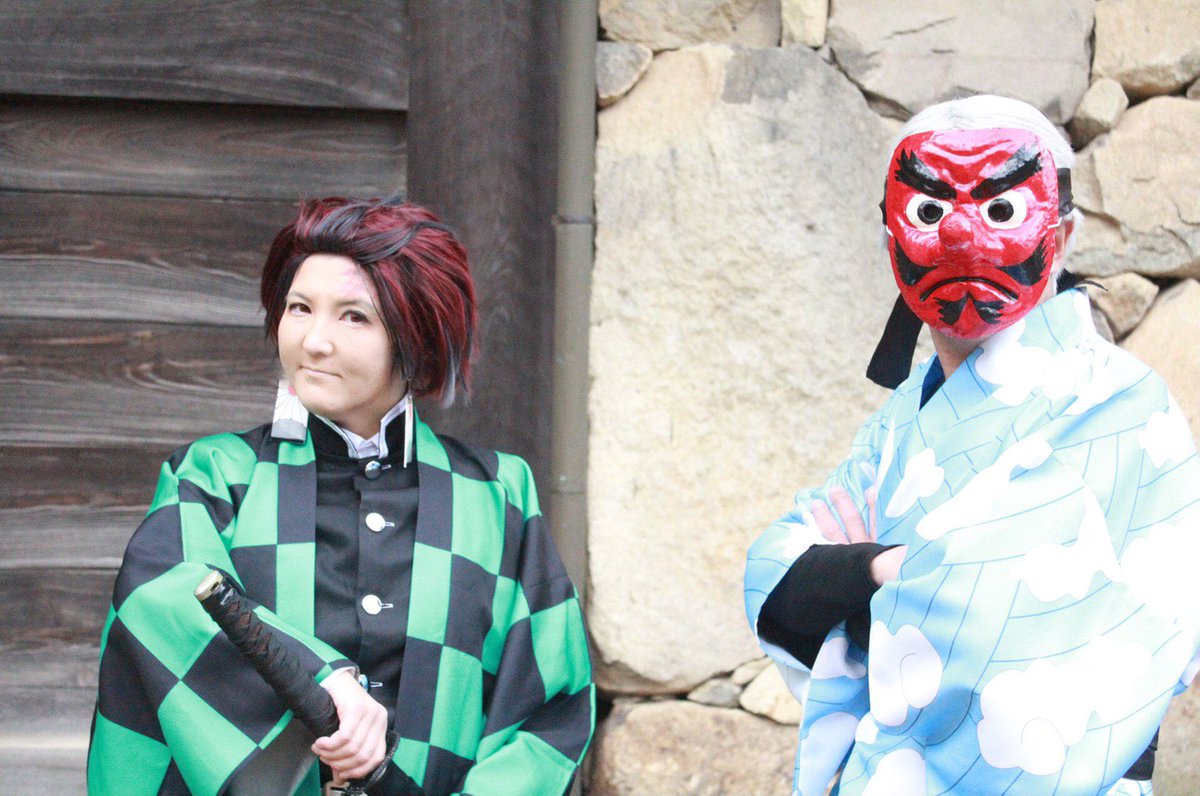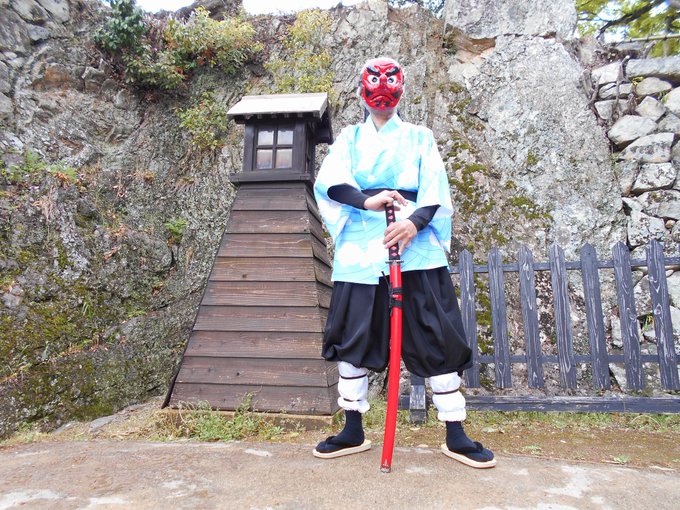 奏真(そーま)さん @s0__m_a7s0 から彦根城で撮影したした写真を頂きました 弟子の炭治郎と並んで撮って頂きありがとうございました🙇♂️ 竈門炭治郎🎴:にゃぁさん @nya_hosi 鱗滝左近次👺:私 #コスメル #彦根城