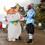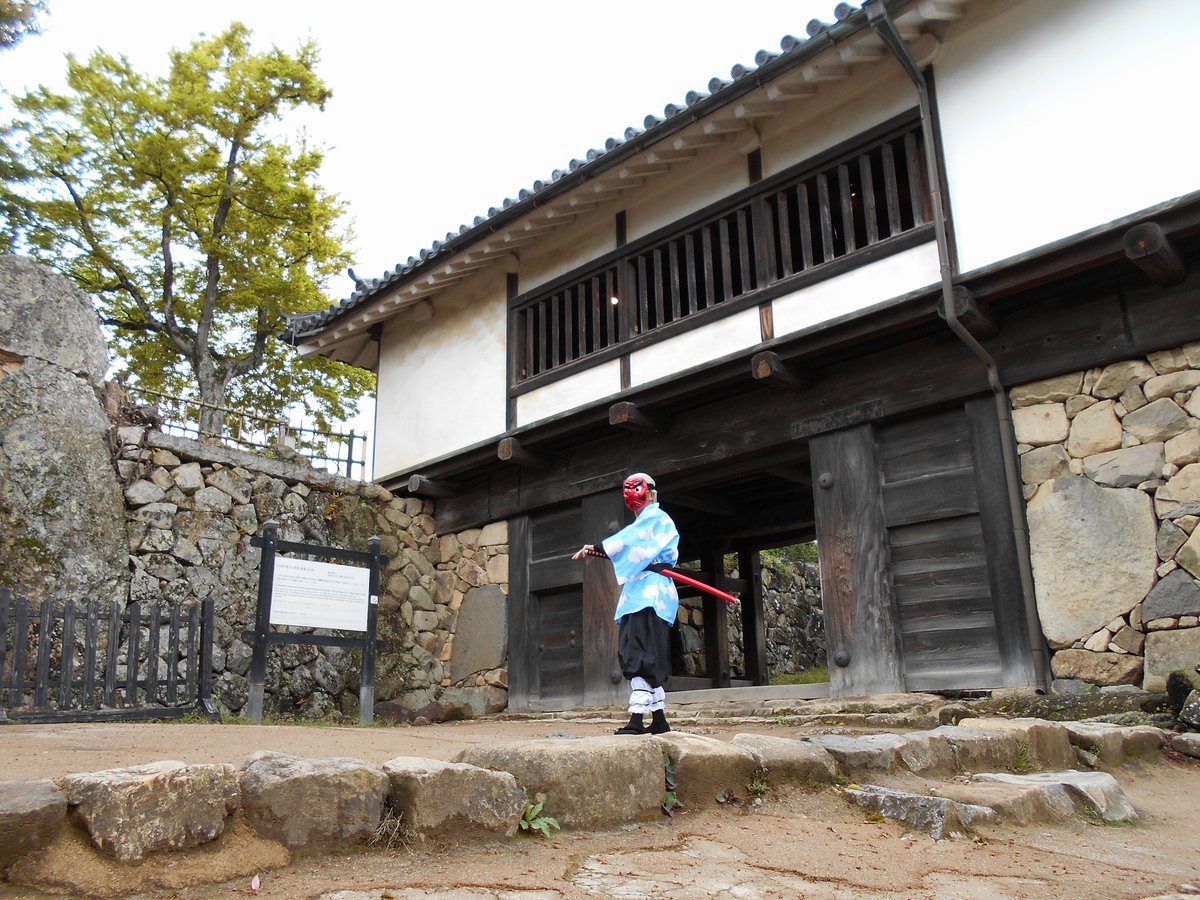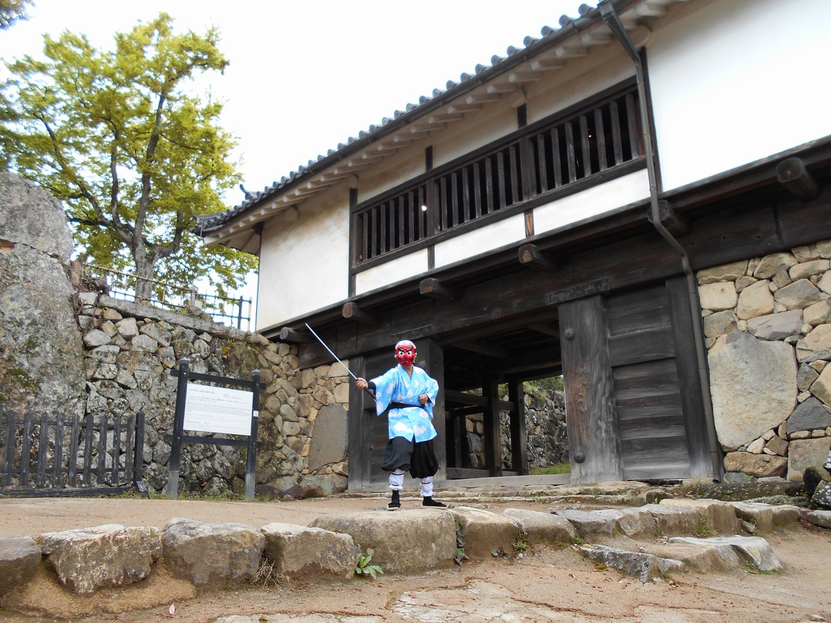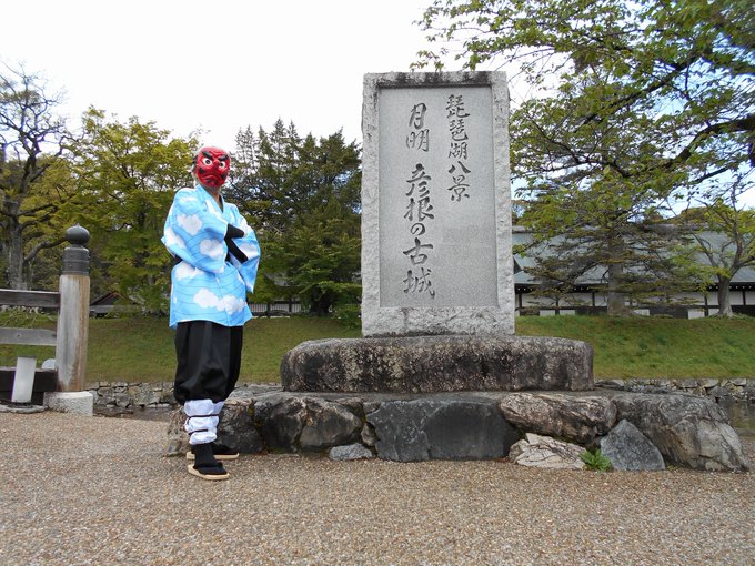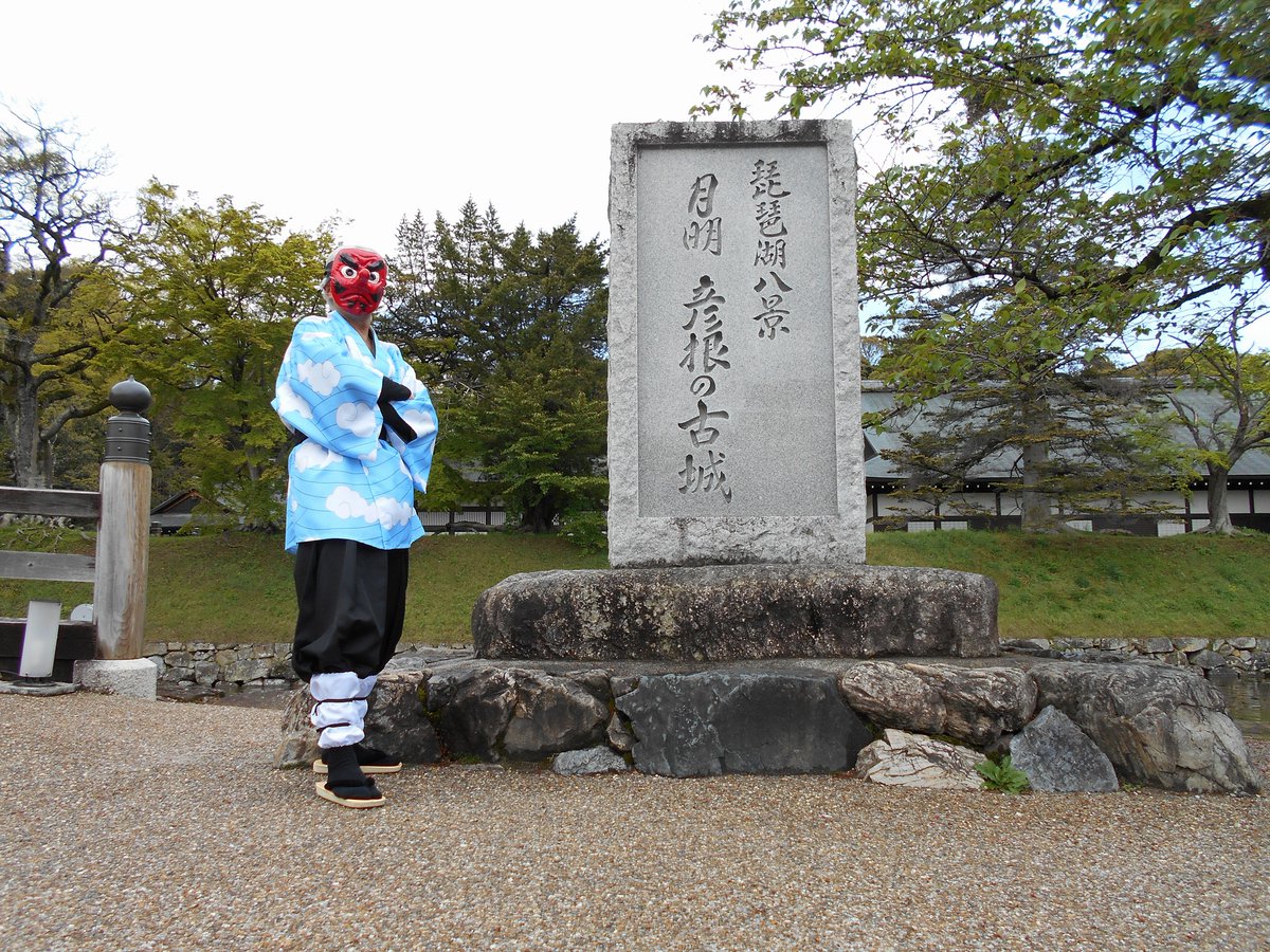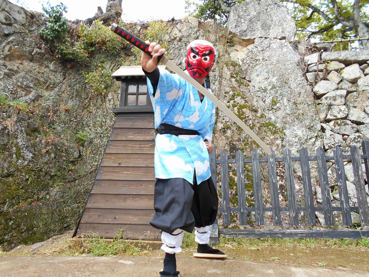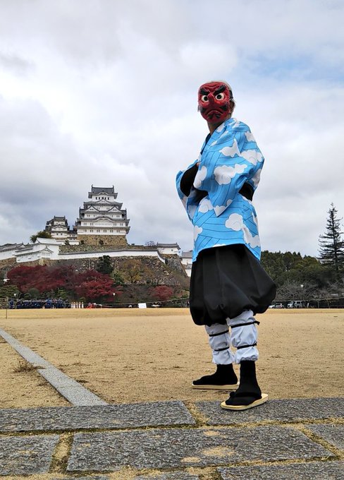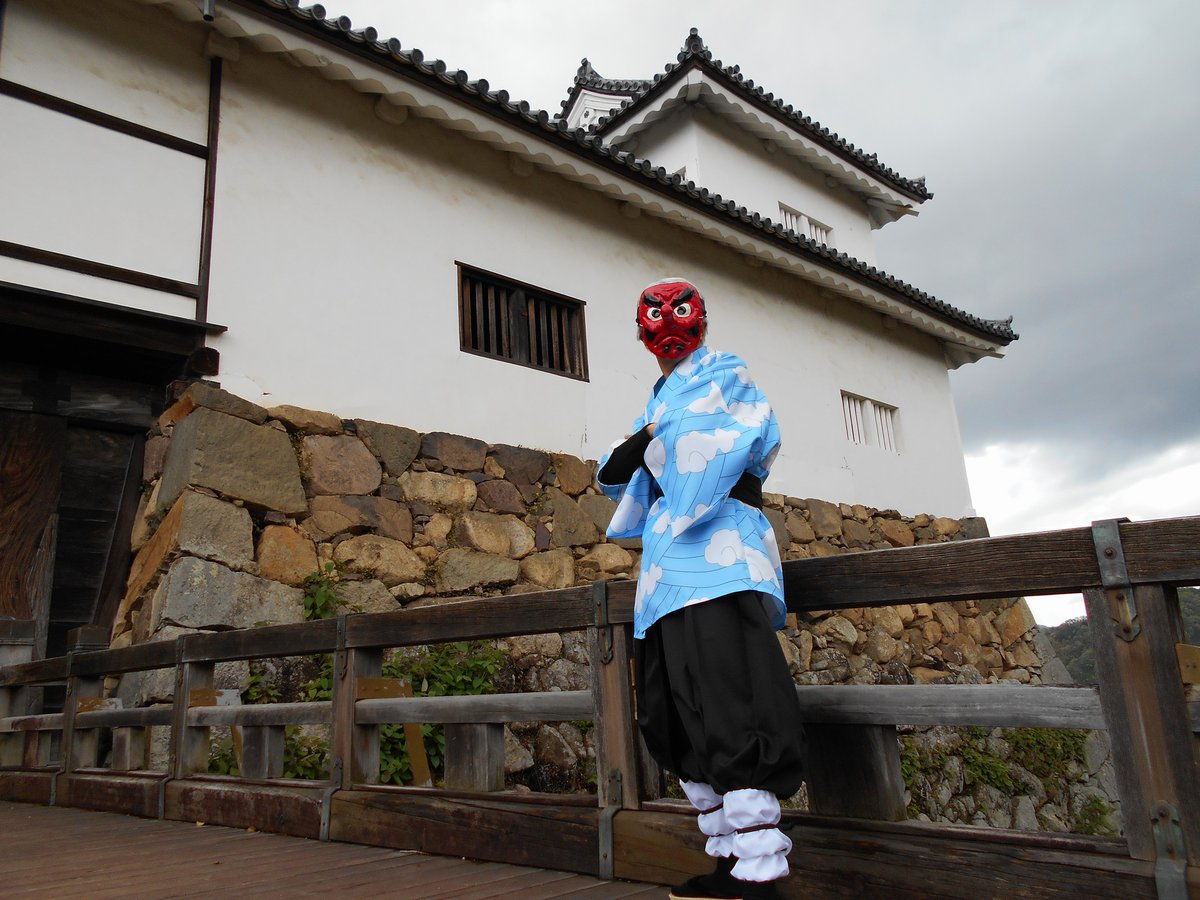 4 23 奏真(そーま)さん @s0__m_a7s0 から彦根城で撮影したした写真を頂きました 弟子の炭治郎と並んで撮って頂きありがとうございました🙇♂️ 竈門炭治郎🎴:にゃぁさん @nya_hosi 鱗滝左近次👺:私 #コスメル #彦根城 21/04/19 23:04