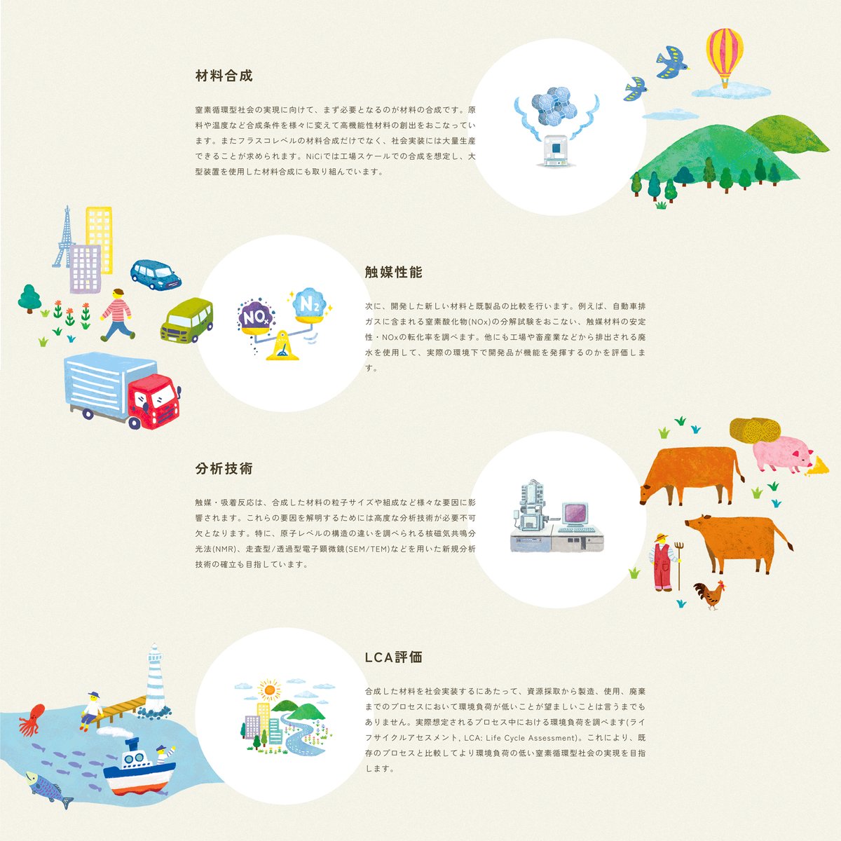 窒素の循環という難しく感じる内容もイラストで少しでも和らいだらと思います! ・ |Works|東京大学大学院工学系研究科脇原研究室「Nici 窒素循環社会プロジェクト」サイトイラスト制作 ・ mofpof.com/posts/46318206 #イラスト 詳細・Nici 窒素循環社会プロジェクト(nici.jpn.org)