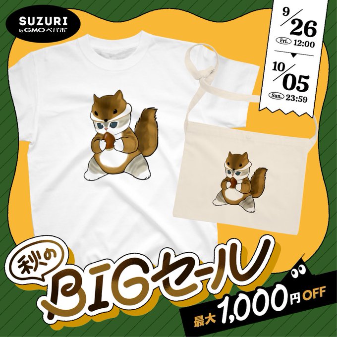 【セールのお知らせ】 SUZURIにて秋のBIGセール開催中🍁✨ ~ 10月5日(日) 23:59まで ▶︎suzuri.jp/mofu_sand セールにあわせて、リスにゃんの イラストも追加しました。 ▶︎ suzuri.jp/mofu_sand/desi…