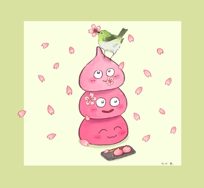 桜とメジロとももいろ三姉妹🌸 #イラスト