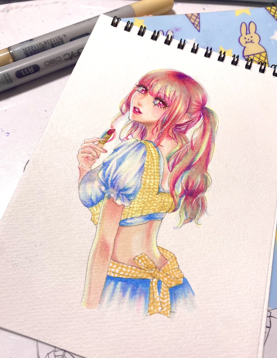 息抜きに下書き無しでコピックで初めてリアルなの描いてみました。。。 🍓🍨苺のパフェ🍨🍓
