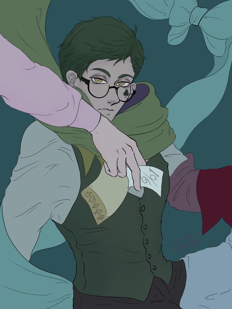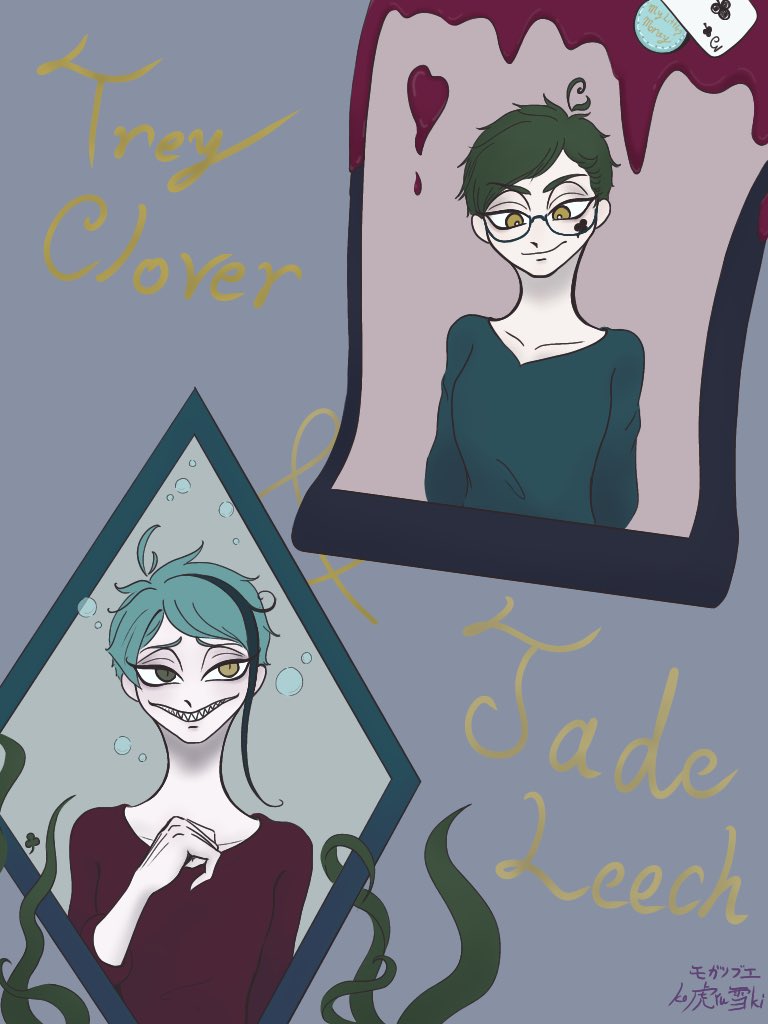 随分前にデジタル清書してやっと仕上げ(?)をした絵ちゃん。名前入れてて「配色センスゥッ‼︎何処にやったの⁈何で其処で止めんのォ‼︎」ってなった。ヘイッ相棒‼︎ ※地味に♣️🐬です。多分。 #トレイ・クローバー #ジェイド・リーチ #ツイステファンアート