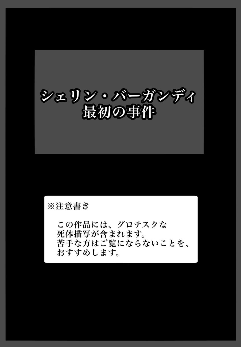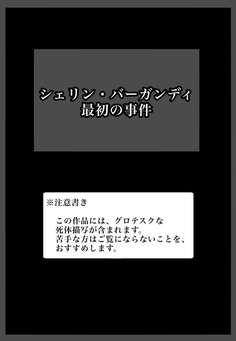 「シェリン・バーガンディ 最初の事件」 ※この漫画には、グロ死体描写が含まれますので、 苦手な方はご注意ください。 また、当然ですがご本人とは全く関係の無い妄想話です。 #シェリンの証拠品
