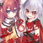 イラスト投稿したけど紹介されなかったのでもう上げちゃいますᐠ( ᐛ )ᐟ (コメントは載ってました。あざます。) 天華百剣8周年おめでとうございます! 八丁念仏ちゃんと八文字長義ちゃんです∞ 見ずらいけど2人の手で『8』作ってます👌 #天華百剣8周年おめでとう #天華百剣お絵かき部