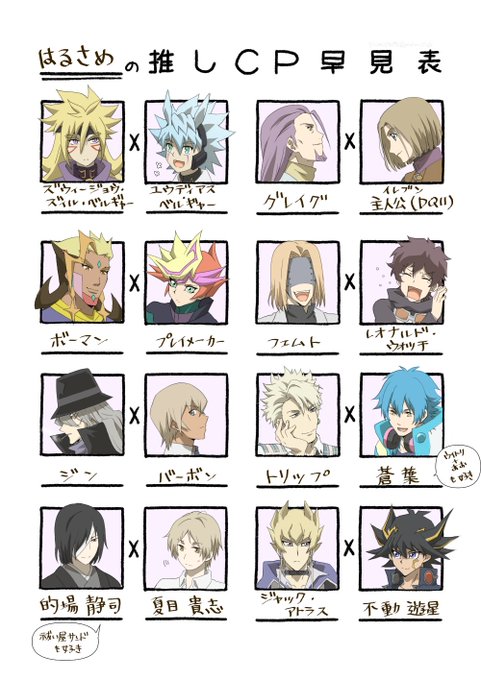 18 56 推しCPテンプレお借りしました😊 自分が描いた事ある作品、1作品1CP縛りにしてます(それしないとヴだけで埋まる) こう見ると、敵対してるorしてた みたいなCPばっかりですね…🤔 顔たくさん描けて楽しかったです 22/08/20 21:47