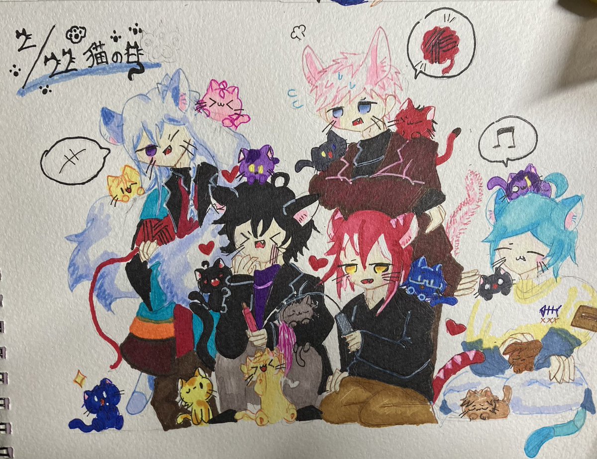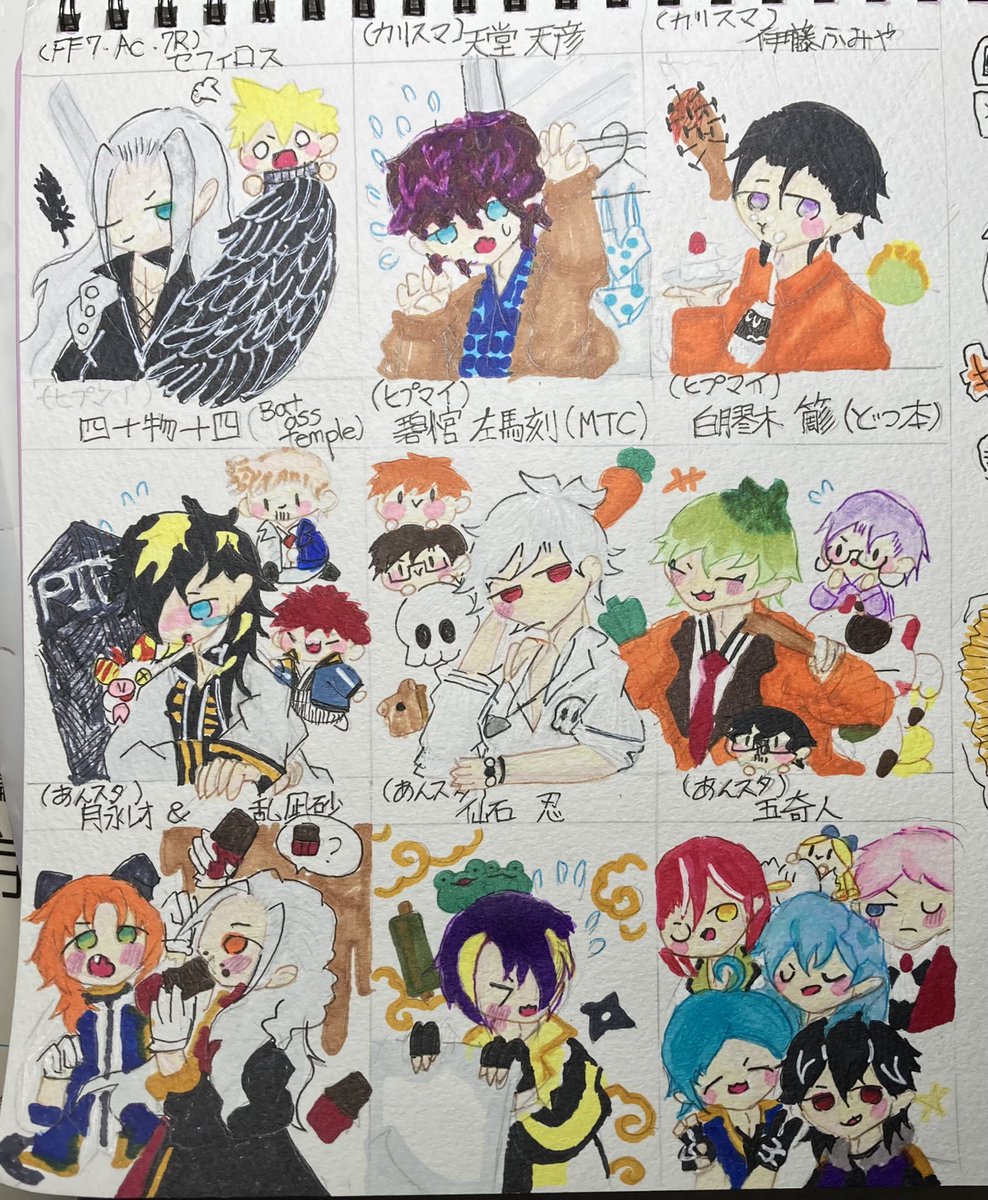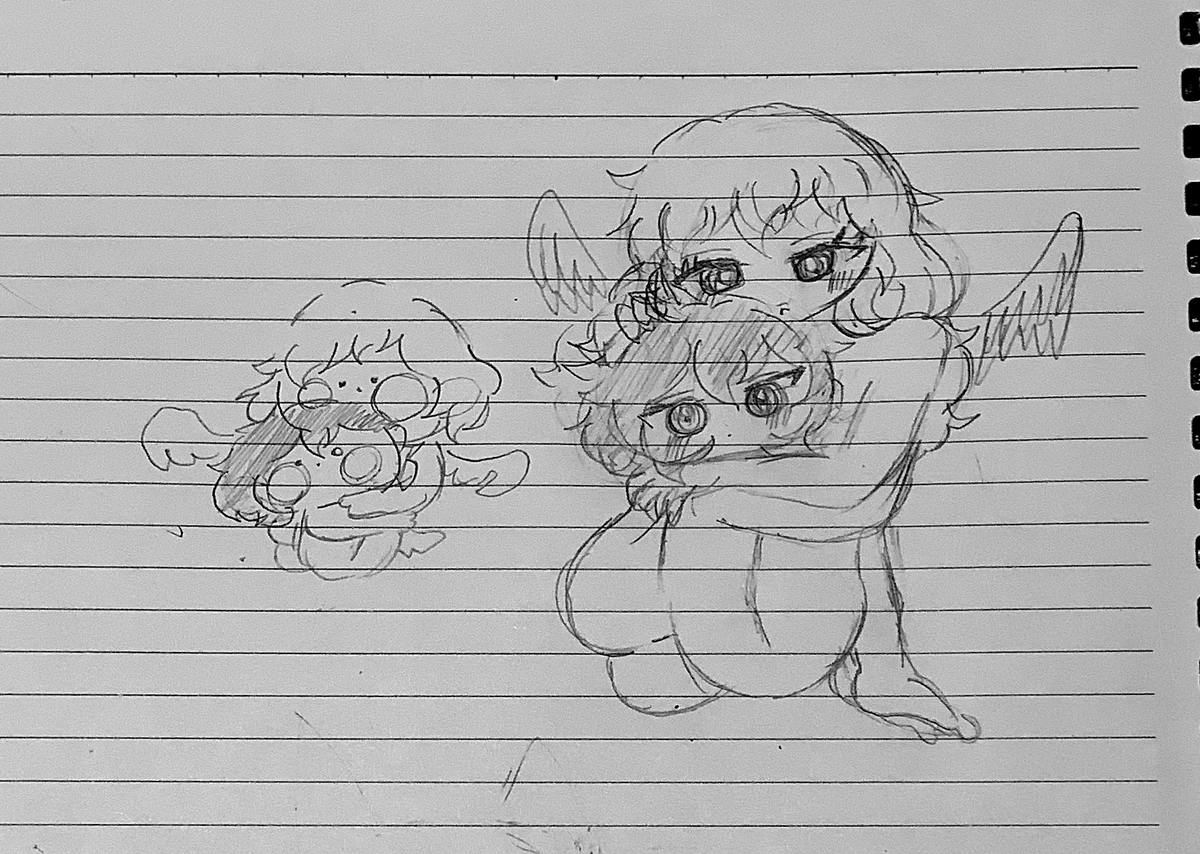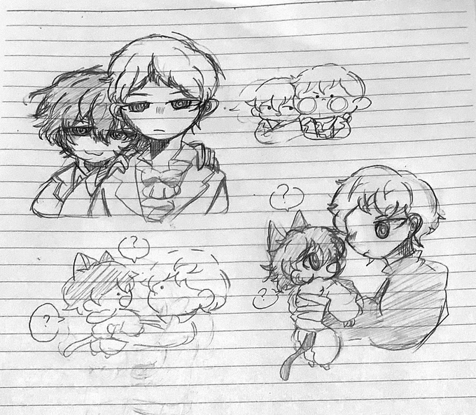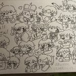 いつも素敵なイラストを拝見しています!😌😌 ネギトロさんの1、2、4のイラストをリメイクしました! アナログで申し訳ないです…🙇♀️🙇♀️🙇♀️ これからもこっそり見させてもらいます…🥰🥰🥰 (横の落書きはおまけでミニキャラで描きました…) twitter.com/Prrr_Prrr_/sta…
