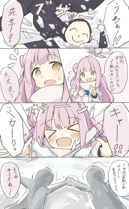 雪で転ぶ先生とミカです