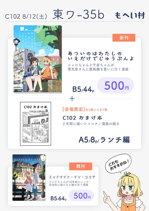 113 282 C102新刊「あついのはわたしのいえだけでじゅうぶんよ」B5/44p/500円で配布します。ホットな漫画描けました。会場おまけ本もあります。よろしくお願いします! (1/3) 23/08/03 21:16