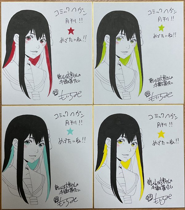 12 22 コミックヘヴン月刊化にあたり 色紙なんかも描きました、おんなじ絵の色違いですが。 読者プレゼントになってます。今回は赤でしたね。 23/03/27 17:31
