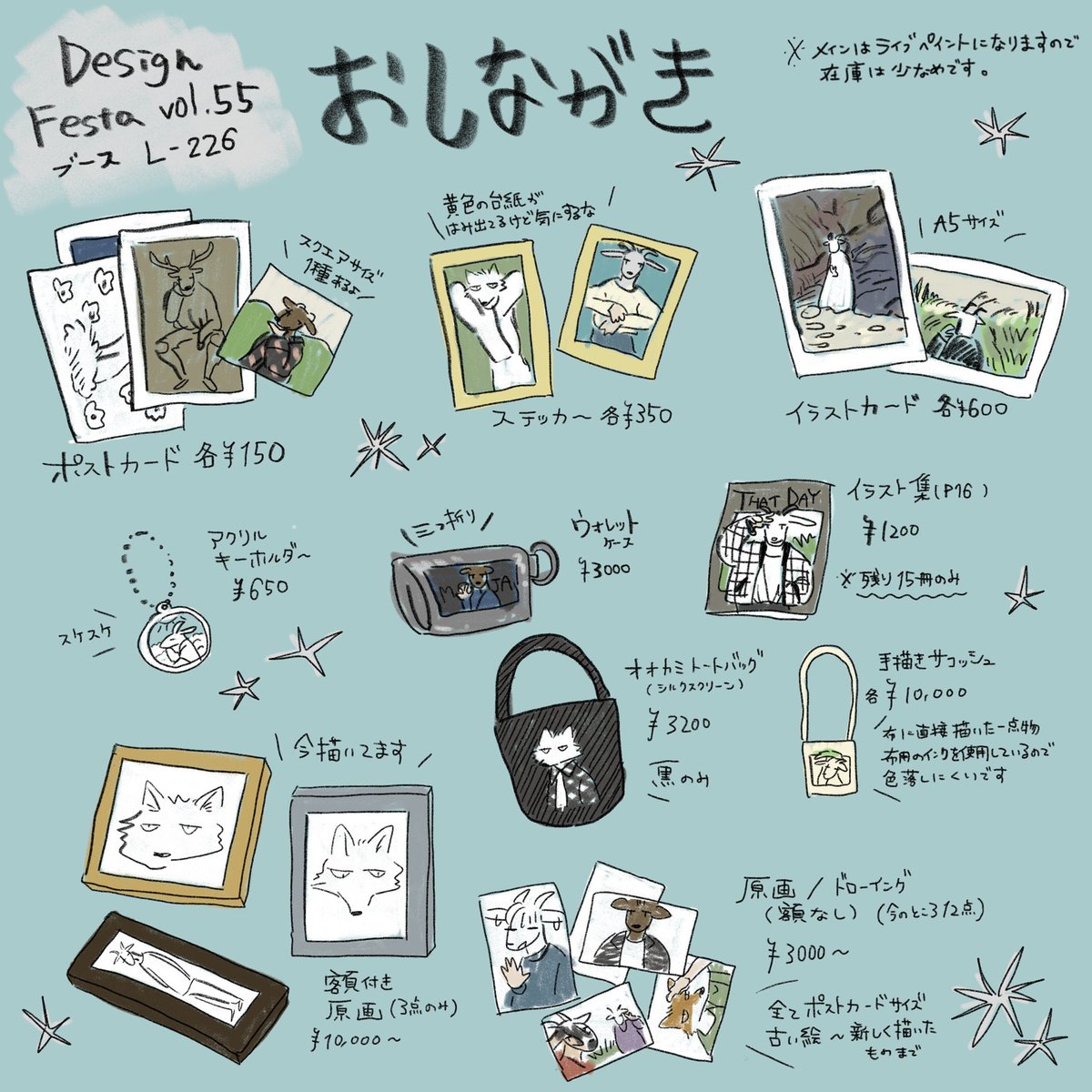 5/21.22のDesign Festa vol.55 のおしながき作りました〜原画やドローイングは当日までに完成させます!ライブペイントしながら待ってます〜👊