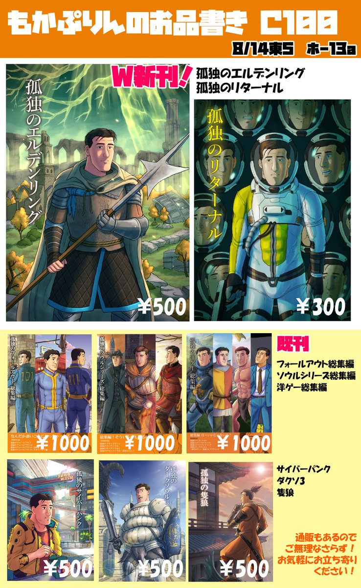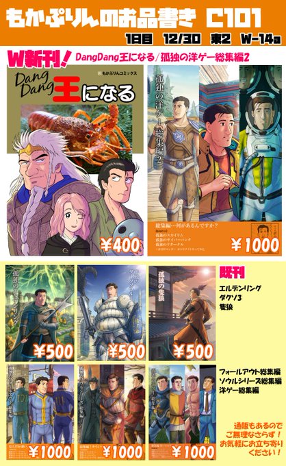 ついに明日、コミケです!ゴローちゃんと雄山のエルデンセットご用意してお待ちしております。洋ゲー総集編2も新刊でつ。W14aです、よろしくお願いします。 #C101お品書き #C101新刊 #EldenRing twitter.com/mokapurin_n/st…