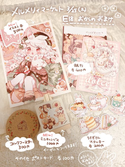 明日3/25(土)のメルメリィマーケットのお品書きですꪔ̤̥ꪔ̤̮ꪔ̤̫ 🌷おかしのおまけ【E-18】 🌷もかろーる 出展は明日のみとなります…! 新作グッズや原画を持っていきます☺️よろしくおねがいします〜!! melmerrymarket.com #メルメリィマーケット #メルメリィ前夜祭