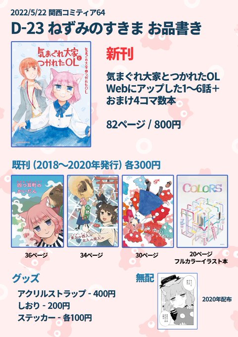 明日の関西コミティアのお品書きよ 新刊はさっきアップした6話まで+おまけの落書き4コマが入ってやや厚い物体になっています。既刊も少し持っていきます。よろしくお願いします。 #関西コミティア64