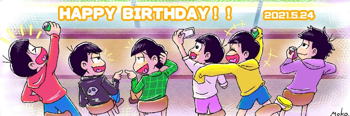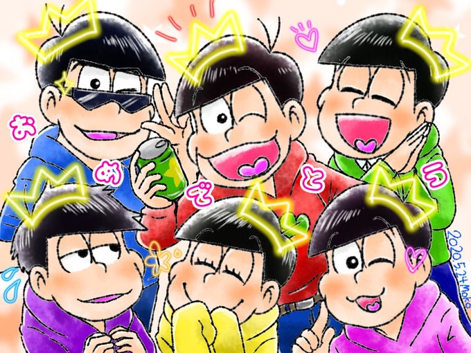 6つ子の皆さ~ん、誕生日おめでとう🎁🎂🎉😆✨ 誕生日でも、変わらずダラダラと過ごしてそうだけど、きっと行く先々でお祝いされてるんだろうなぁ✨ #松野家6つ子生誕祭お祝いイラスト #松野家6つ子生誕祭2021