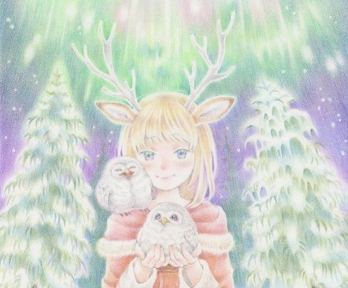 オーロラとフクロウです😊途中の絵にご反応くださった方、ありがとうございました😃 #色鉛筆