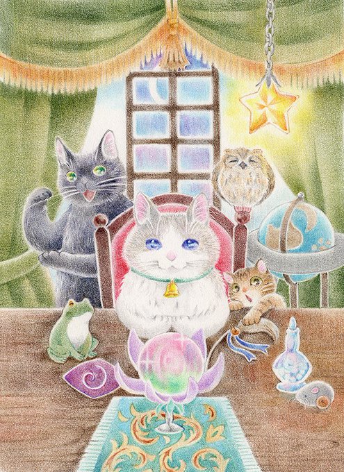 占い猫三兄妹🐱体に合ったおいしいカリカリを占ってくれます お代はヒゲ一本・・・ 途中に反応くださった方、ありがとうございました☺ #色鉛筆イラスト