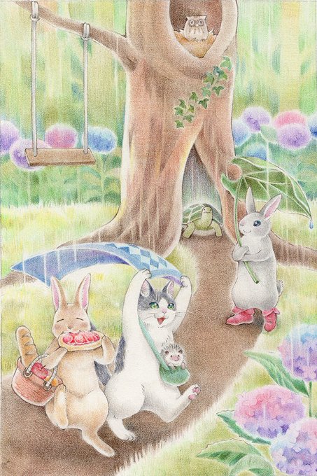 完成しました~ 食いしん坊のうさぎさんとしっかり者の猫さんです☺ #色鉛筆