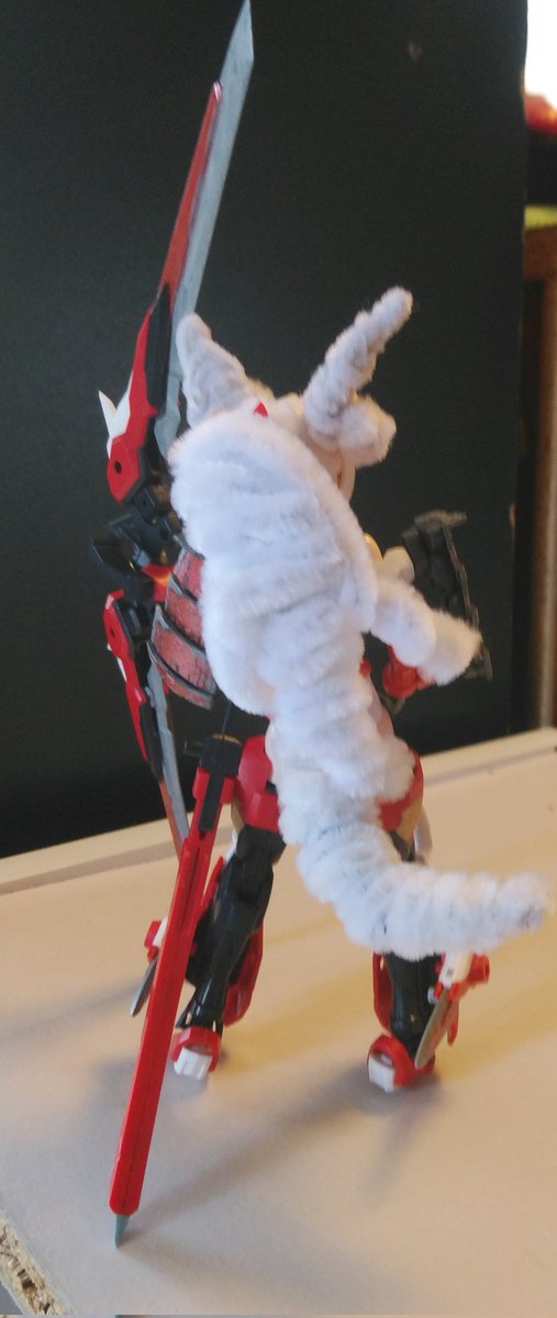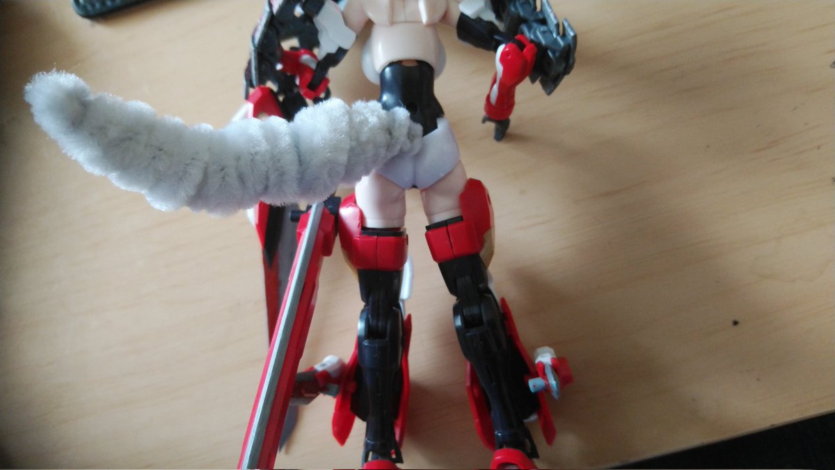 尻尾は内部のフレームにモールを引っ掛けて、それを芯に形を意識しながら巻いて太らせます。(狐ならさつまいも型) で、おしりの方のパーツを少し削って普通に挟み込んで完成。 モールはそうそうちぎれないし接着剤も要らないからやり直しも簡単です。 #メガミデバイス