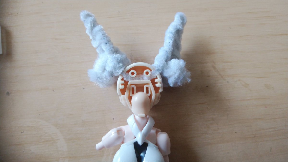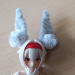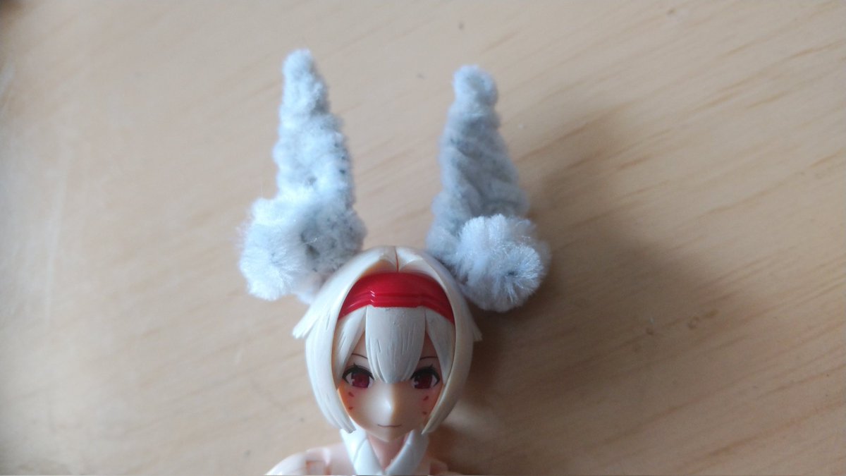 後頭部のパーツに溝掘って、狐耳パーツ挟み込んでます。 耳パーツはモール製(手芸屋や百均に売ってます) カチューシャみたいな形に骨組み作って、狐耳なら長めの二等辺三角形になるよう骨組みに巻いてく。 で付け根をつまみ出して、丸めたモールをつけます。 最後に挟み込んで完成 #メガミデバイス