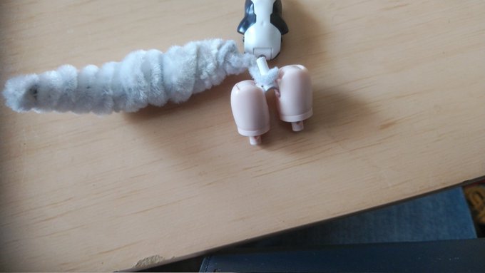 1 3 尻尾は内部のフレームにモールを引っ掛けて、それを芯に形を意識しながら巻いて太らせます。(狐ならさつまいも型) で、おしりの方のパーツを少し削って普通に挟み込んで完成。 モールはそうそうちぎれないし接着剤も要らないからやり直しも簡単です。 #メガミデバイス 22/07/15 12:54