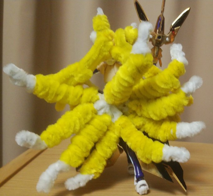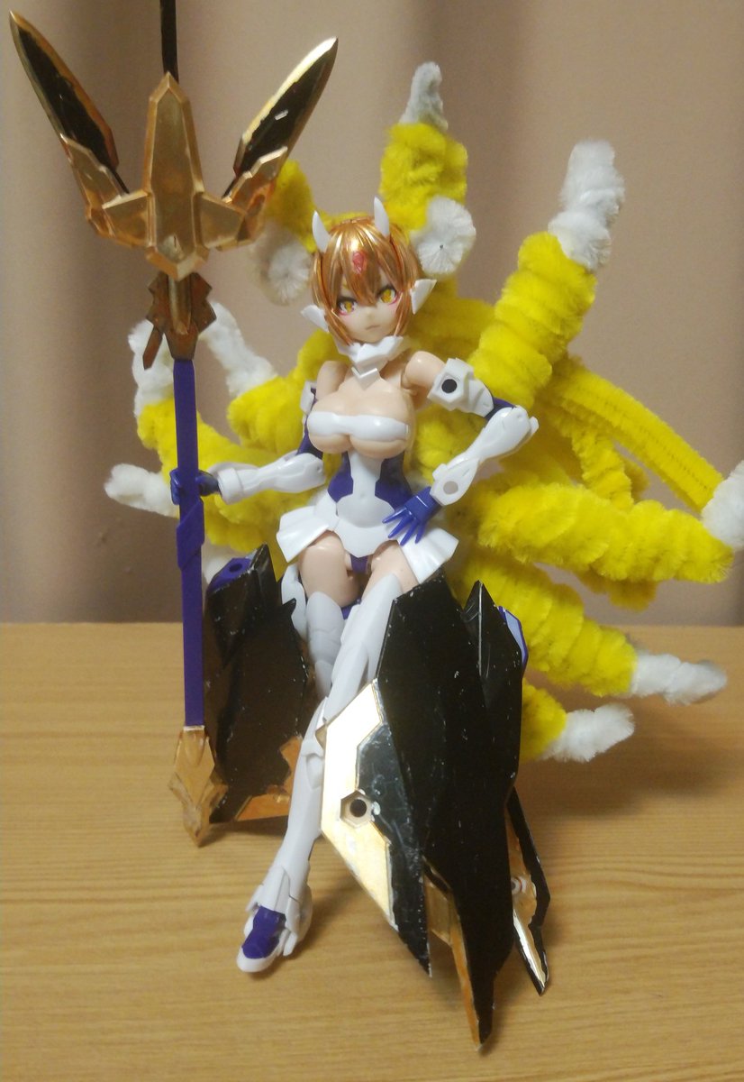 2 2 本体に繋がってる尻尾は1本、あとの8本は放射状に繋がってて、本体に繋がってる尻尾の根元の方で繋げてあるモールを結わえて9本になってます。 #メガミデバイス 23/05/12 20:06